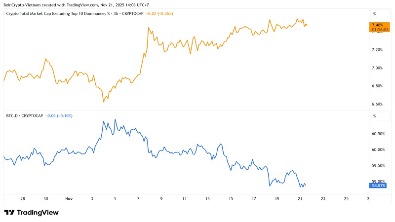 نمودار نشان میدهد که در ماه نوامبر، دامیننس آلتکوینهای دیگر (OTHERS.D) از ۶.۶ درصد به ۷.۴ درصد افزایش یافت. در همین حال، دامیننس بیتکوین (BTC.D) از ۶۱ درصد به ۵۸.۸ درصد کاهش یافت.