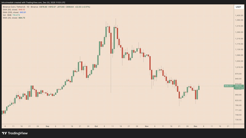 بایننس کوین روز چهارشنبه بالای ۹۱۰ دلار معامله شد، در حالی که چشم به بازگشت احتمالی به سمت ۱٬۰۰۰ دلار داشت.