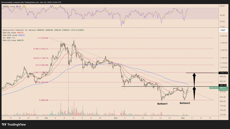 ریکاوری BNB توسط یک الگوی کف دوقلو در نمودار چهار ساعته که نزدیک منطقه تقاضای ۸۰۰ تا ۸۲۰ دلار شکل گرفته است، حمایت میشود.