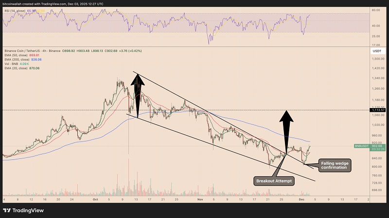 هدف صعودی اندازهگیریشده الگوی کنج به سمت منطقه ۱٬۱۰۰ تا ۱٬۱۱۵ دلار در ماه دسامبر اشاره دارد. البته اگر شکست حفظ شود. معاملهگری به اسم CryptoBull_360 پیشبینی کرد که قیمت BNB ممکن است حتی به سمت ۱٬۳۰۰ دلار یا بیشتر حرکت کند.