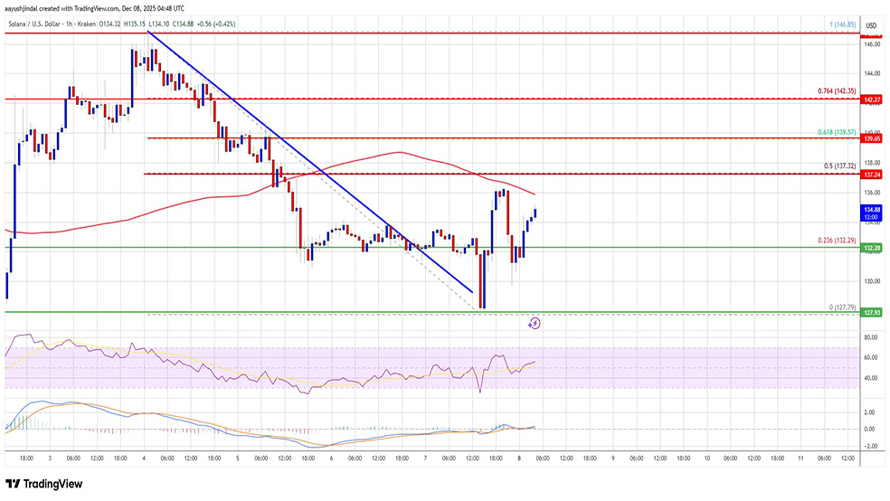 قیمت سولانا پس از رسیدن به محدوده ١٢٨ دلار توانست مانند بیتکوین و اتریوم وارد یک موج بازیابی ملایم شود و دوباره از سطح ١٣٠ دلار عبور کند. سولانا همچنین از سطح اصلاحی ٢٣.٦ درصد فیبوناچی مربوط به ریزش از سقف ١٤٧ دلار تا کف ١٢٨ دلار عبور کرده و در نمودار یکساعته، خط روند نزولی مهمی را با مقاومت ١٣٢ دلار شکسته است.
