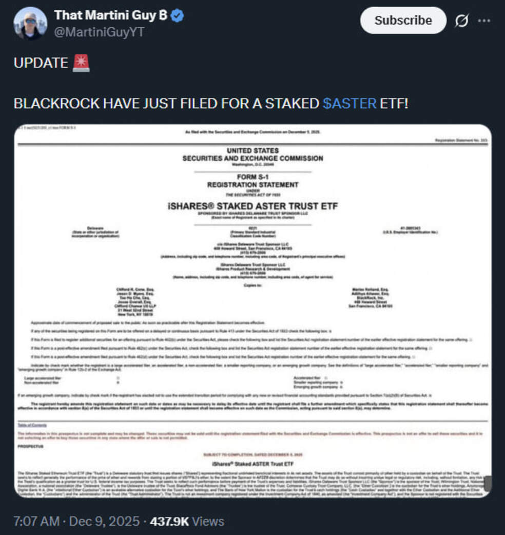 پست مربوط به ثبت ETF بلکراک، که توسط یک روزنامهنگار در X منتشر شده بود، تصویر سندی را نشان میداد که ادعا میشد در ۵ دسامبر با عنوان iSHARES® STAKED ASTER TRUST ETF ثبت شده است.