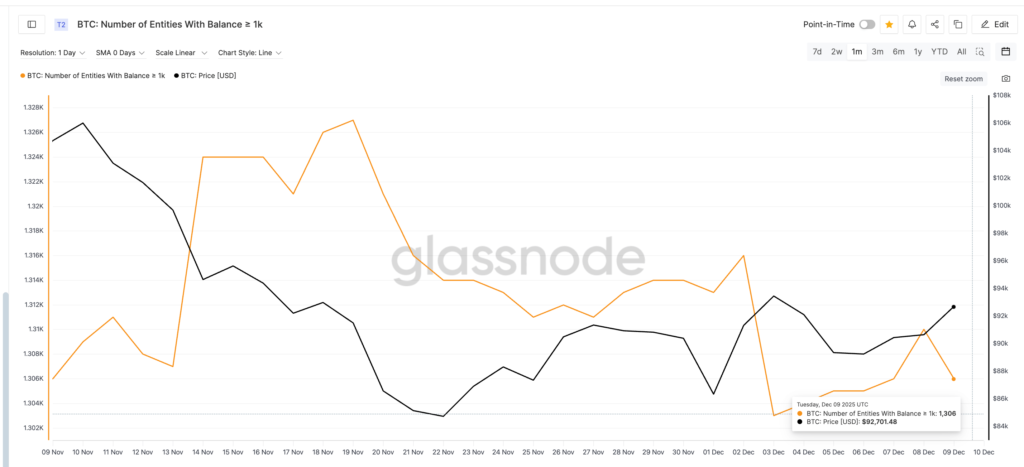 موجودیتهایی که دستکم ۱,۰۰۰ بیت کوین در اختیار دارند، از ۱۹ نوامبر (۲۸ آبان) تاکنون در حال کاهش پوزیشن هستند. این شاخص در ۳ دسامبر به کف یکماهه یعنی ۱,۳۰۳ نهاد رسید و اکنون نیز نزدیک همین عدد باقی مانده است. این احتیاط نهنگها باعث میشود هر حمله به مقاومت با کمبود قدرت خرید حمایتکننده مواجه شود.