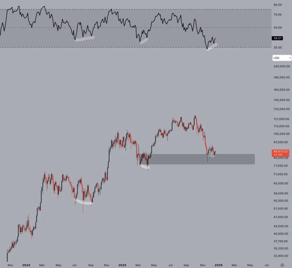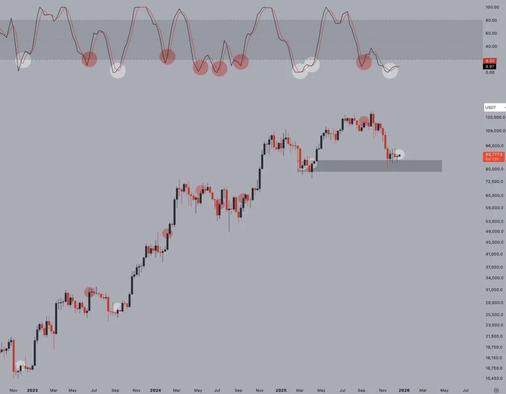 بر اساس تحلیلهای جدید در ماه دسامبر، شاخص استوکستیک RSI در نمودار هفتگی بیت کوین از سطوح اشباع فروش (Oversold) به سمت بالا چرخش کرده است. معاملهگران این آرایش را به عنوان یک سیگنال کلاسیک میشناسند که از لحاظ تاریخی در نقاط عطف کلیدی بازار ظاهر میشود. تحلیلگران به الگوهای مشابهی در اوایل سال ۲۰۱۹ (پس از کف ۳۲۰۰ دلاری)، مارس ۲۰۲۰ (ریزش کرونا) و اواخر ۲۰۲۲ (کف ۱۵۵۰۰ دلاری) اشاره میکنند. در تمام این موارد، ابتدا مومنتوم تغییر جهت داد و سپس قیمت با تاخیر شروع به رشد کرد.