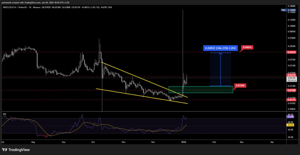 در تایم فریم روزانه، قیمت میمکوین بروکلی به یک محدوده حمایتی بسیار مهم (باکس سبز رنگ) رسیده است. اگر بروکلی بتواند این ناحیه را حفظ کند، سناریوی پامپ قیمت دور از انتظار نیست. با توجه به تحلیل، انتظار میرود که با شروع روند صعودی از این ناحیه، قیمت پتانسیل رسیدن به هدف ۰.۰۴۶ دلار را داشته باشد. تحقق این سناریو میتواند سودی بالغ بر ۱۶۶ درصد را نصیب هولدرهای این ارز کند که عددی بسیار جذاب برای معاملهگران کوتاهمدت است.