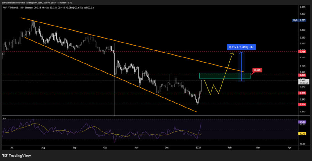 بررسی قیمت WIF نشان میدهد که این میم کوین درون یک الگوی بازشونده نزولی در حال نوسان بوده و اخیراً پس از برخورد به کف این الگو، با مومنتوم صعودی قدرتمندی روند رشد را آغاز کرده است. در حال حاضر، تثبیت قیمت بالای محدوده حمایتی ۰.۳۲۸ دلار حیاتی است. در صورت حفظ این حمایت و شکست مقاومت کلیدی ۰.۴۶۵ دلار، انتظار میرود روند صعودی شتاب بیشتری بگیرد و قیمت داگ ویف هت رشدی حدود ۷۵ درصد از نواحی فعلی را تجربه کند.