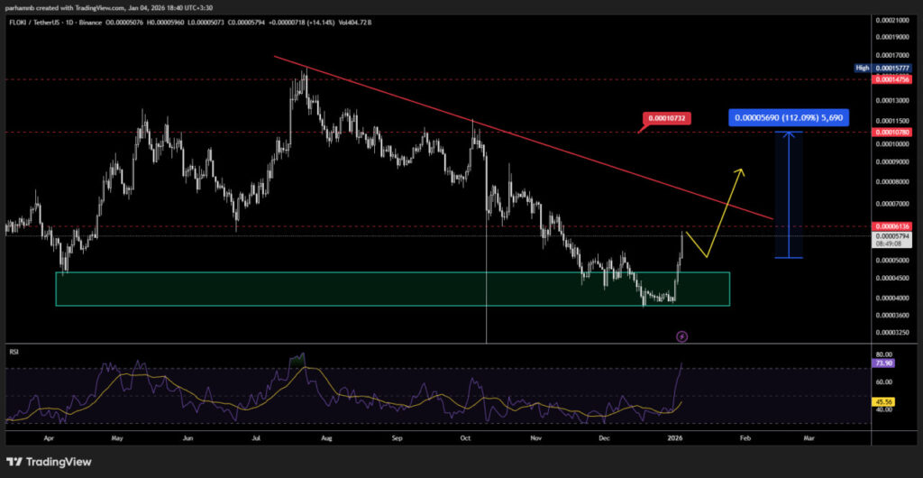 با بررسی نمودار قیمت فلوکی، مشاهده میشود که این رمزارز پس از رشد اخیر خود، نیاز به اصلاحی ۱۰ تا ۱۵ درصدی دارد تا انرژی لازم برای موج صعود را دریافت کند. حفظ باکس سبز رنگ حمایتی که در نمودار مشخص شده، شرط اصلی برای تداوم این روند افزایشی است. در صورت واکنش مثبت به این حمایت، انتظار میرود قیمت به سمت هدف ۰.۰۰۰۱۰ دلار حرکت کند که به معنای رشد چشمگیر ۱۱۰ درصدی برای سرمایهگذاران خواهد بود.