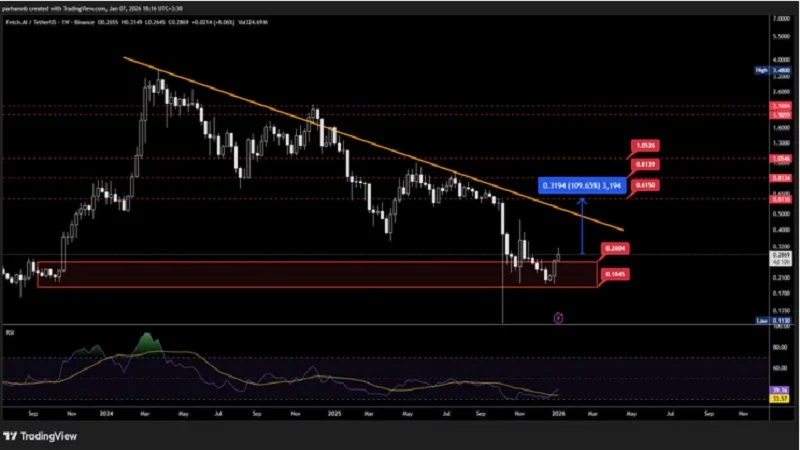 فچ (FET) از پروژههایی است که روی «ایجنتهای هوش مصنوعی» و اقتصاد ماشین به ماشین مانور جدی دارد و در بخش AI بازار، جایگاه پررنگی گرفته است. از نظر تکنیکال و در تایم فریم هفتگی، قیمت فچ بعد از رسیدن به یک محدوده حمایتی مهم در ناحیه ۰.۱۸ تا ۰.۲۶ دلار (باکس قرمز)، توانسته شروع حرکت صعودی قابلقبولی را ثبت کند.