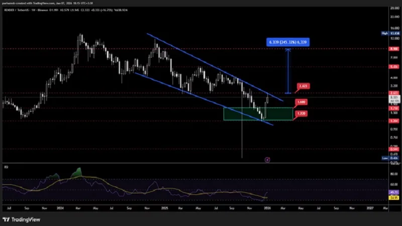 رندر (RENDER) معمولاً در کنار داستان GPU و تقاضای پردازشیِ مرتبط با تولید محتوا و مدلهای AI مطرح میشود و از این جهت در موج AI جایگاه طبیعی دارد. از منظر تکنیکال در تایم هفتگی، قیمت رندر پس از تشکیل یک فشردگی نزولی و رسیدن به کف حمایتی ۱.۲۲ تا ۱.۶۸ دلار، با افزایش تقاضا مواجه شده و به سمت سقف این ساختار حرکت کرده است.