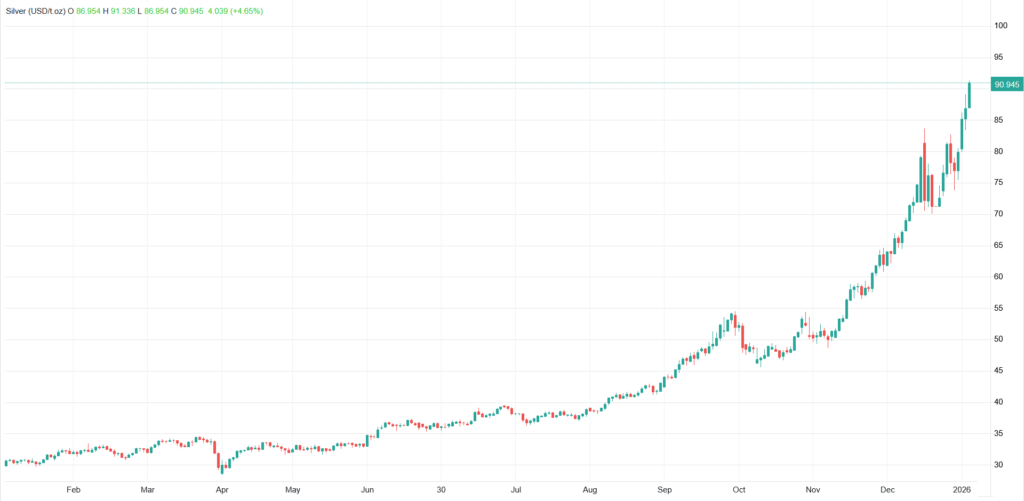 نقره نیز در حالی سقف جدید ۹۱ دلار و ۳۳ سنتی در هر اونس را لمس و روند صعودی خود را به بالاترین سطوح جدید قیمتی ادامه داد که در حال حاضر با رشد چشمگیر ۴.۶۵ درصدی (۴ دلاری) در قیمت ۹۰ دلار و ۹۴ سنتی داد و ستد میشود.