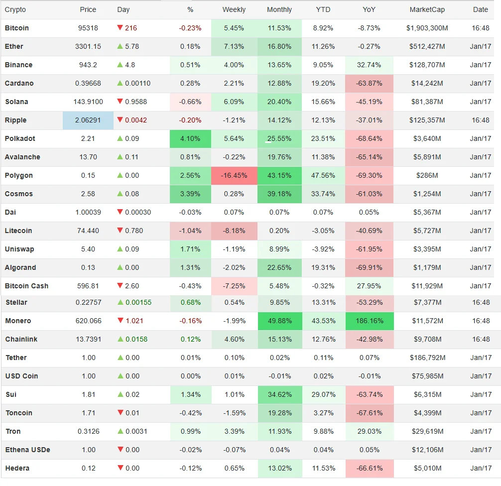 بیتکوین و اتریوم در معاملات عصرگاهی کمحجم روز گذشته به ترتیب در قیمت ۹۵۲۷۴ و ۳۳۰۱ دلار داد و ستد شدند.