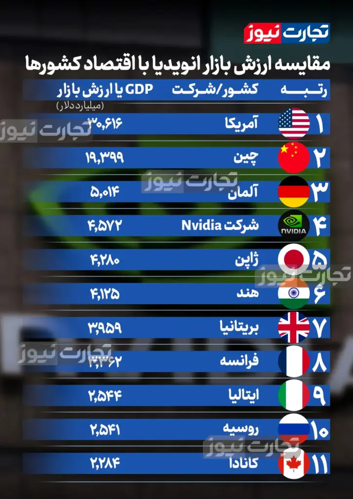 اگرچه مقایسه ارزش بازار (Market Cap) که بیانگر ارزش کل سهام یک شرکت است، با تولید ناخالص داخلی (GDP) که ارزش کل تولید کالاها و خدمات سالانه یک کشور است، از نظر اقتصادی یک مقایسه مستقیم نیست؛ اما میتواند اندازه و مقیاس عظیم Nvidia در مقایسه با اقتصاد جهانی را نشان بدهد.