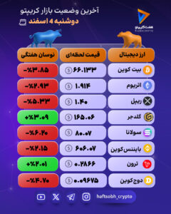 به گزارش هفت کریپتو، بازار ارزهای دیجیتال در چهارم اسفند ۱۴۰۴ همچنان در مسیر اصلاح حرکت میکند. از میان هشت رمزارز محبوب، شش نماد در محدوده منفی قرار گرفتهاند و تنها دو رمزارز رشد مثبت داشتهاند که نشان میدهد بازار در فاز ریسکگریزی قرار دارد و سرمایهگذاران ترجیح میدهند از داراییهای پرنوسان فاصله بگیرند. بیتکوین با قیمت ۶۶ هزار دلار و افت هفتگی ۳.۸۵ درصدی، همچنان تحت فشار فروش است. خروج سرمایه از ETFها، کاهش ورود پول نهادی و نگرانیهای کلان اقتصادی باعث شده این رمزارز در مسیر اصلاح باقی بماند. این افت ملایم نشاندهنده کاهش اعتماد کوتاهمدت است، هرچند ساختار بلندمدت بازار همچنان حفظ شده است.