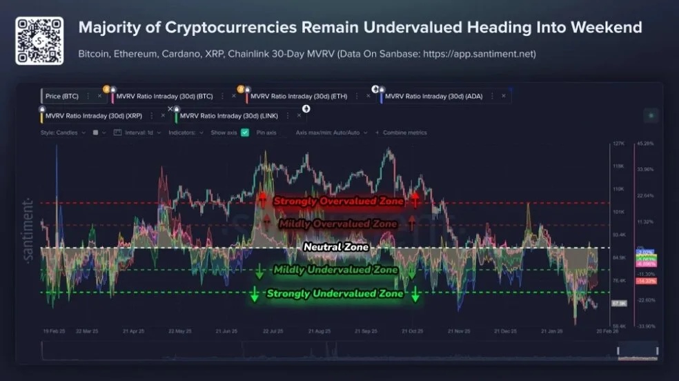 به گزارش هفت کریپتو، دادههای آنچین Santiment نشان میدهد چند رمزارز بزرگ، از جمله بیت کوین، اتریوم، کاردانو، چین لینک و XRP، زیر «میانگین قیمت خرید هولدرهای کوتاهمدت» خود معامله میشوند و به محدوده «کمارزشگذاری» یا Undervalued وارد شدهاند. در همین حال، شاخص ترس و طمع کریپتو، در وضعیت «ترس شدید» قرار دارد.