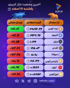 یکشنبه، هفدهم اسفند ۱۴۰۴، بازار ارزهای دیجیتال روزی دوگانه را پشت سر گذاشت. در یک سوی میدان، بیتکوین با رشد ۱.۰۶ درصدی به ۶۷,۰۹۴ دلار رسید و ترون با افزایش ۱.۹۷ درصدی، بهترین عملکرد روزانه را ثبت کرد. در سوی دیگر، دوجکوین با سقوط ۴.۴۸ درصدی بدترین عملکرد را داشت و گلدجر و سولانا نیز بیش از ۳.۶ درصد کاهش یافتند.