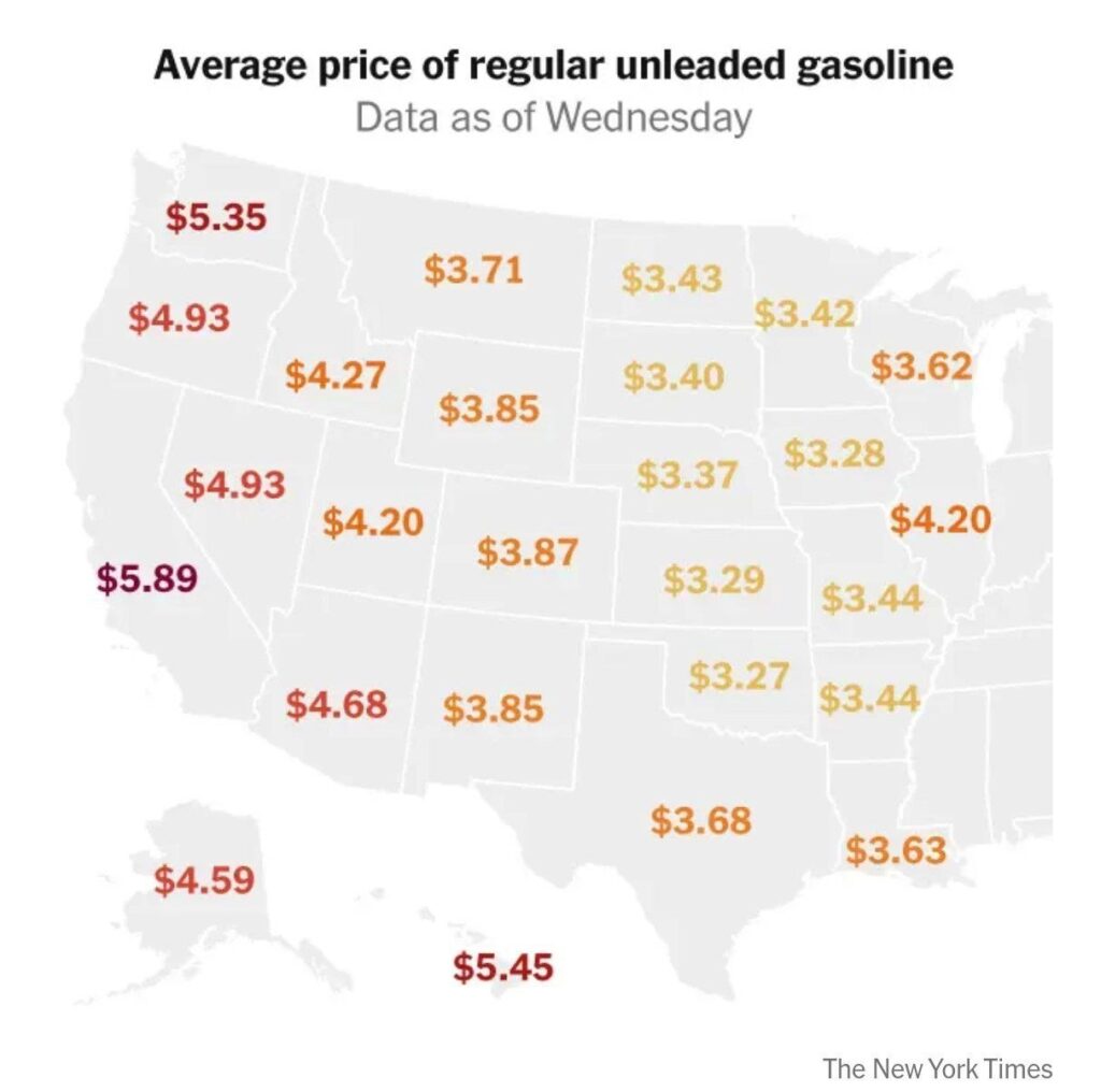 نیویورک تایمز نقشه ای از افزایش قیمت بنزین در ایالت های مختلف آمریکا منتشر کرد که نشان می دهد، قیمت بنزین در برخی ایالت ها از 5 دلار هم فراتر رفته است.