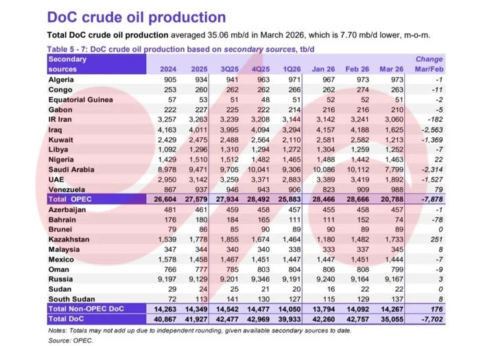 به گزارش هفت کریپتو به نقل از مهر به نقل از دبیرخانه سازمان کشورهای صادرکننده نفت (اوپک)، تولید نفت ۱۲ کشور عضو این سازمان بر اساس تازهترین گزارش (ماه آوریل ۲۰۲۶)، در ماه مارس ۲۰۲۶ (اسفند – فروردین)، درمجموع روزانه ۲۰ میلیون و ۷۸۸ هزار بشکه بوده که نسبت به ماه فوریه (بهمن – اسفند)، روزانه ۷ میلیون و ۸۷۸ هزار بشکه کاهش داشته است.