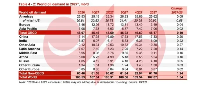 بر اساس تازهترین گزارش ماهانه دبیرخانه اوپک (آوریل)، تقاضای جهانی نفت خام برای سال ۲۰۲۷ با روزانه یک میلیون و ۳۴۰ هزار بشکه افزایش همراه خواهد بود. مجموع تقاضای نفت جهان برای سال ۲۰۲۷، ۱۰۷ میلیون و ۸۷۰ هزار پیشبینی شده است.