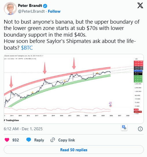 در سمت دیگر، پیتر برنت (Peter Brandt) معاملهگر باسابقه دوباره سناریوی ریزش بیت کوین به زیر ۴۰٬۰۰۰ دلار را مطرح کرده است. همانطور که گزارش دادیم، هفته گذشته برنت عبور دوباره قیمت بیت کوین از ۹۰٬۰۰۰ دلار را «الگوی جهش گربه مرده» توصیف کرده بود؛ الگویی که از جهش موقتی قیمت پیش از یک ریزش سنگین خبر میدهد، جهشی که او میگوید اکنون احتمالا به پایان خودش رسیده است.