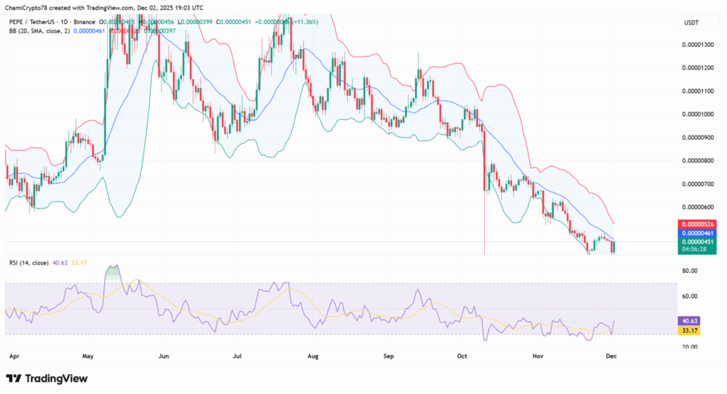 مهمترین سیگنال صعودی، تشکیل الگوی کف دوقلو (Double Bottom) است که یک الگوی بازگشتی قدرتمند محسوب میشود. این الگو نشان میدهد که خریداران در دو نقطه کلیدی وارد عمل شدهاند و کنترل بازار را در دست گرفتهاند. در حال حاضر، قیمت پپه روی ۰.۰۰۰۰۰۴۵۱ دلار قرار دارد و بالاتر از این سطح حمایتی تثبیت شده است.