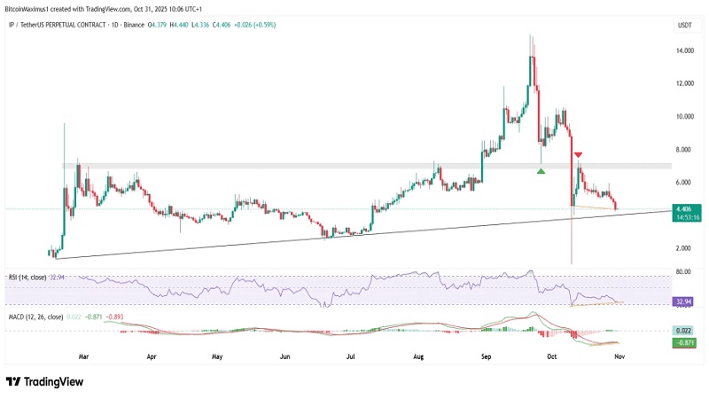 قیمت توکن IP از زمان اوج خود در ۲۱ سپتامبر (۱۴.۹۶ دلار) کاهش چشمگیری داشته است. در ابتدا، حرکت نزولی در محدودهی حمایتی ۷ دلار متوقف شد و با یک جهش همراه بود. با این حال، در ۱۰ اکتبر IP از این حمایت سقوط کرد و برای مدت کوتاهی به کف جدیدی رسید، سپس بازگشت و سایهی بلندی در پایین کندل ایجاد کرد.