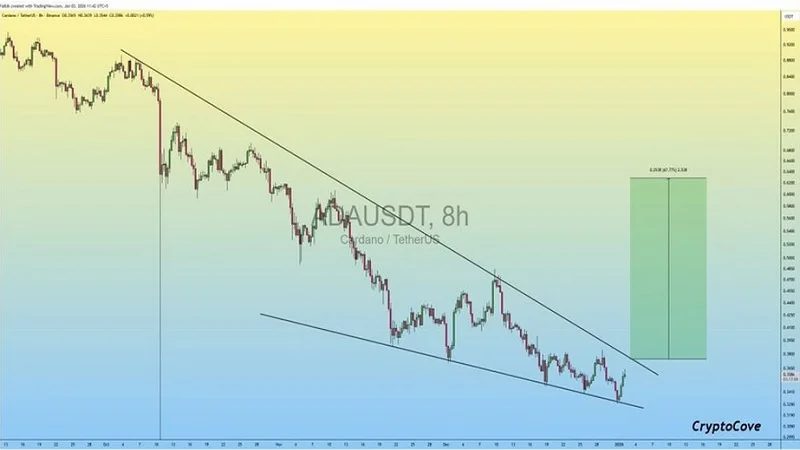 چند ماه گذشته، قیمت کاردانو در حال حرکت در یک «کنج نزولی» بوده است؛ یعنی قیمت هنوز کاهش پیدا میکند ولی فشار فروش کمکم ضعیفتر میشود. وقتی این کنج باریک میشود، نشان میدهد که یک حرکت بزرگ در راه است.