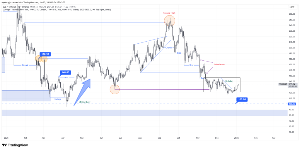 نقطه قابلتوجه در این مسیر، رفتار سولانا در محدوده ۱۲۰ دلار بود. در روزهای پایانی سال، زمانی که حجم معاملات بهطور طبیعی کاهش مییابد و بسیاری از بازیگران بزرگ در وضعیت انتظار قرار میگیرند، قیمت موفق شد نقدینگی زیر این سطح را جمعآوری کند. این حرکت، برخلاف افتهای قبلی، با مجموعهای از کندلهای صعودی متوالی همراه شد؛ کندلهایی که اگرچه از نظر حجم هنوز به سطح نرمال بازار نرسیدهاند، اما از منظر ساختار کندلی و تداوم حرکت، پیام متفاوتی نسبت به گذشته ارسال میکنند.