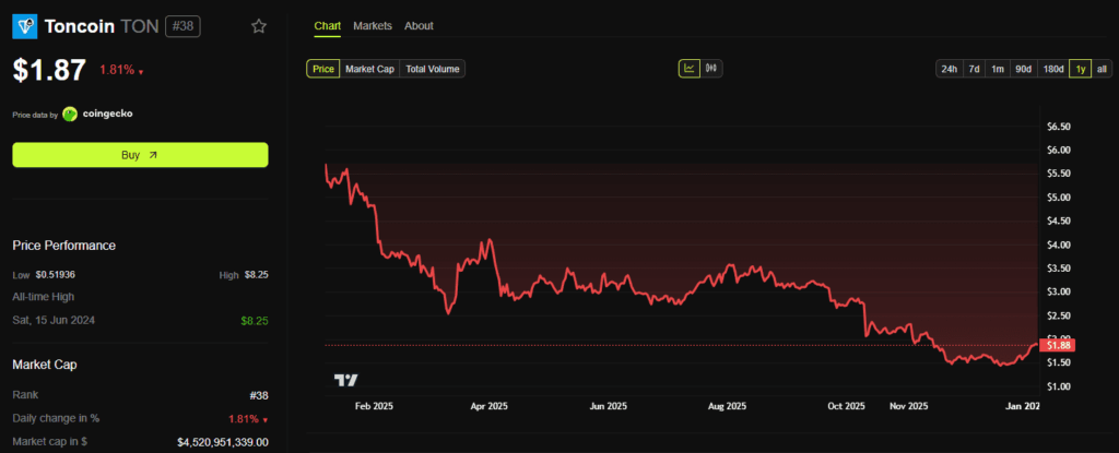 در همین حال، CoinGecko گزارش داد که TON Strategy در حال حاضر متحمل ضرر است. این شرکت بیش از ۴ درصد از کل عرضه TON را در اختیار دارد که اکنون بیش از ۴۰۶ میلیون دلار ارزش دارد. در حالی که ۷۱۳ میلیون دلار برای جمعآوری این موقعیت هزینه کرده است.