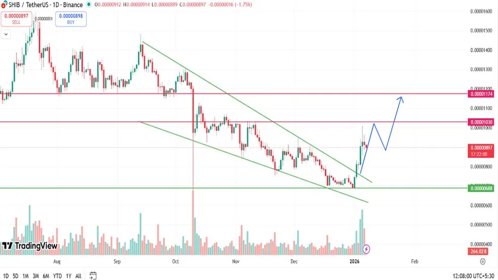 شیبا اینو سال ۲۰۲۶ را با رشد قیمت شروع کرده است. بعد از یک دوره طولانی کاهش، قیمت از کانال نزولی خارج شده و نشانههایی از جمعآوری و انباشت دیده میشود.