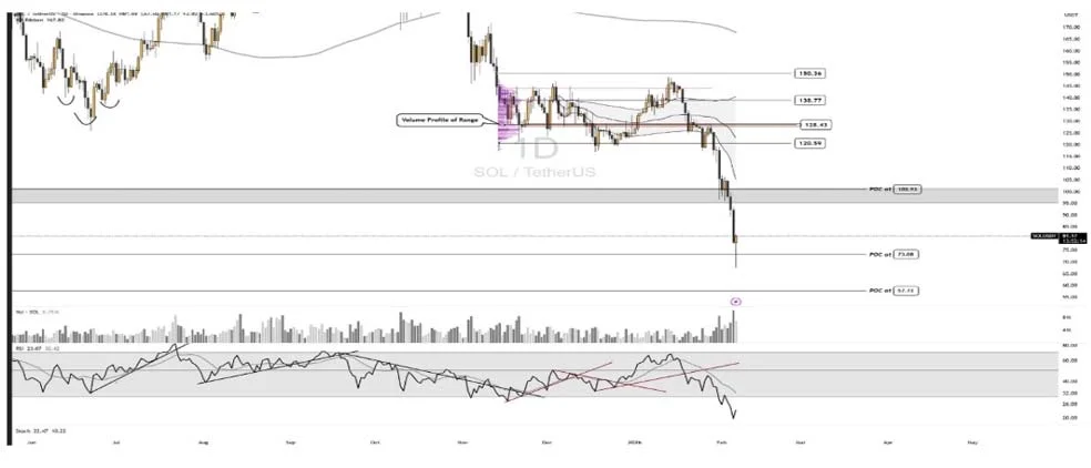 بر اساس تحلیل عمیر کریپتو، حرکت قیمتی سولانا پس از شکست سطوح حمایتی کلیدی و سقوط به زیر ۸۰ دلار در اوایل این هفته، بهشدت نزولی شد. این تحلیلگر اشاره کرد که سولانا نقطه کنترل (POC) یعنی سطحی که بیشترین حجم معاملات در آن انجام شده، در محدوده ۱۰۰ دلار از بازه ژانویه ۲۰۲۴ (دی ۱۴۰۲) را از دست داد. در نتیجه، قیمت بهسرعت به سمت منطقه POC بعدی بین ۶۷ تا ۷۳ دلار سقوط کرد. این کاهش نشاندهنده افت حدود ۲۷ درصدی بود و نشان داد که سطوح قیمتی بالاتر در میان ضعف گسترده بازار چقدر شکننده شدهاند.
