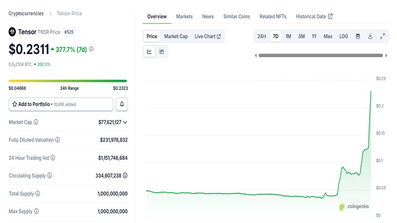 رشد انفجاری تنسور در حالی رقم خورد که این توکن تنها در ۲۴ ساعت گذشته حدود ۷۸ درصد جهش داشته و همین عملکرد فراتر از بازار، نگاه بسیاری از معاملهگران را به خود جذب کرده است.