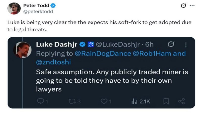 چهرههایی مانند پیتر تاد اعلام کردند که دشجر ممکن است قصد داشته باشد با فشار قانونی، این سافتفورک را به جامعه بیتکوین تحمیل کند.