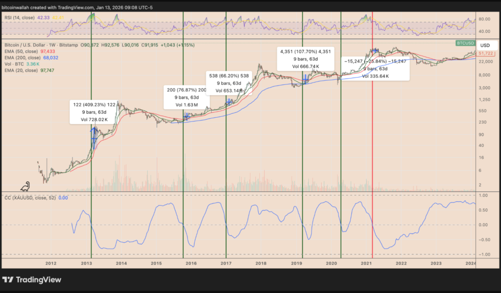 یکی دیگر از سیگنالهای کلان اقتصادی که با فرضیه شکست همسو بود، رابطه تاریخی بیتکوین با طلا بود. در نمونههای گذشته که همبستگی بیتکوین با طلا منفی شد، بیتکوین به طور متوسط ۵۶ درصد در عرض تقریباً دو ماه رشد کرد. تنها استثنا در می ۲۰۲۱ بود که به دلیل شوکهای خارجی از جمله سرکوب استخراج چین و کاهش اجباری اهرم رخ داد.