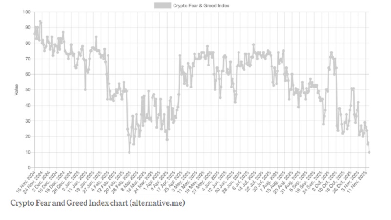 احساسات در بازار رمزارزها بهطور قابلتوجهی تضعیف شده است؛ شاخص ترس و طمع به عدد ۱۰ سقوط کرده که نشاندهنده «ترس شدید» است و پایینترین سطح این شاخص در ۹ ماه اخیر به شمار میرود؛ سطحی که از اواخر ماه فوریه تاکنون مشاهده نشده بود.