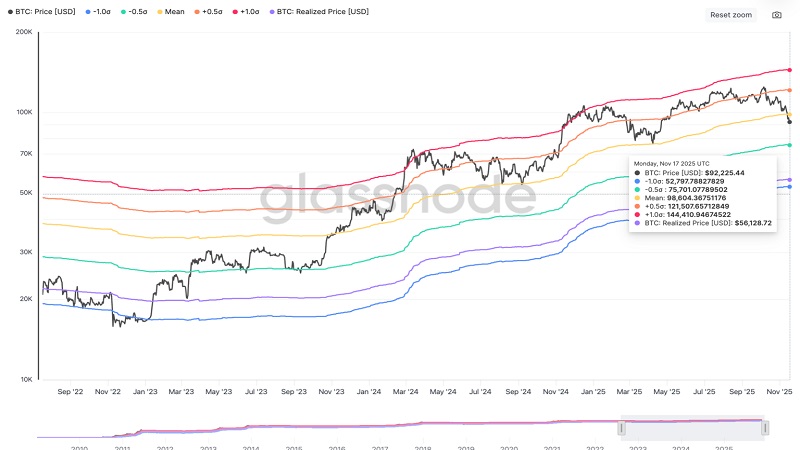 فشار فروش فعلی در حال حاضر عمدتا به دلیل شکستهشدن یکی از مهمترین سطوح حمایتی بیت کوین نشات گرفته است؛ سطحی که با توجه به باندهای شاخص MVRV میتوان به اهمیت آن پی برد. این باندها مجموعهای از خطوطاند که مشخص میکنند آیا قیمت بیتکوین بالاتر یا پایینتر از میانگین هزینه خرید هولدرها قرار دارد و بر همین اساس، دورههای بیشارزشگذاری یا کمارزشگذاری را نشان میدهند.
