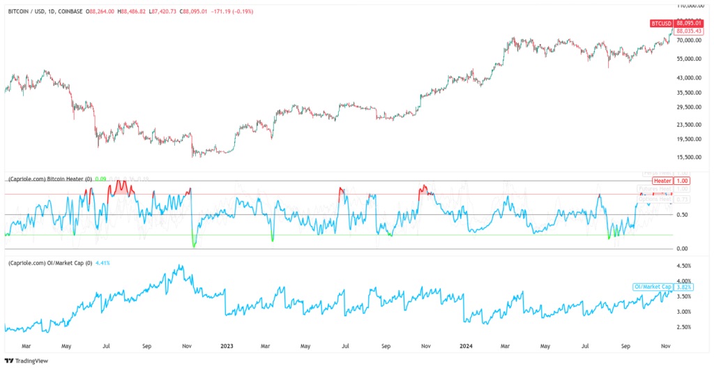 این شاخص که توسط شرکت کپریول اینوستمنتز (Capriole Investments) طراحی شده، میزان «حرارت نسبی» در بازار قراردادهای پرپچوال، فیوچرز و آپشن را بر اساس دادههای مبتنی بر سود باز (OI) اندازهگیری میکند و حالا دوباره وارد محدوده سبز عمیق شده است که آخرینبار در نوامبر ۲۰۲۲ دیده شد.