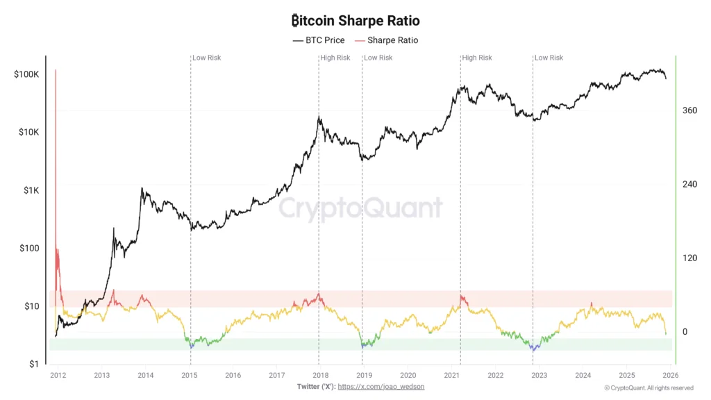 دادههای پلتفرم تحلیل آنچین کریپتوکوانت (CryptoQuant) نشان میدهد نسبت شارپ (Sharpe Ratio) بیت کوین به پایینترین سطح چندساله رسیده است که آخرینبار در میانه سال ۲۰۲۳ دیده شده بود.