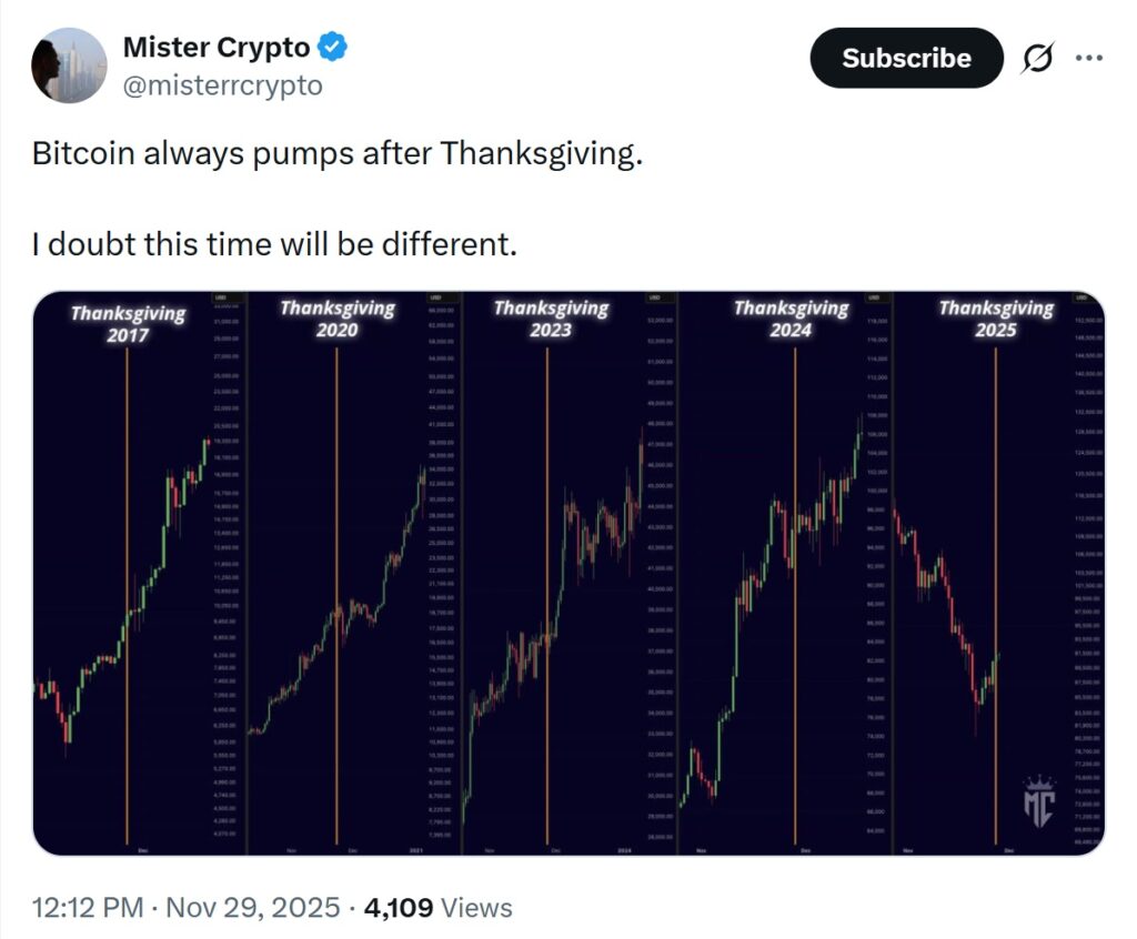 میستر کریپتو: بیت کوین همیشه بعد از روز شکرگذاری رشد میکند، فکر نمیکنم اینبار نیز متفاوت باشد.