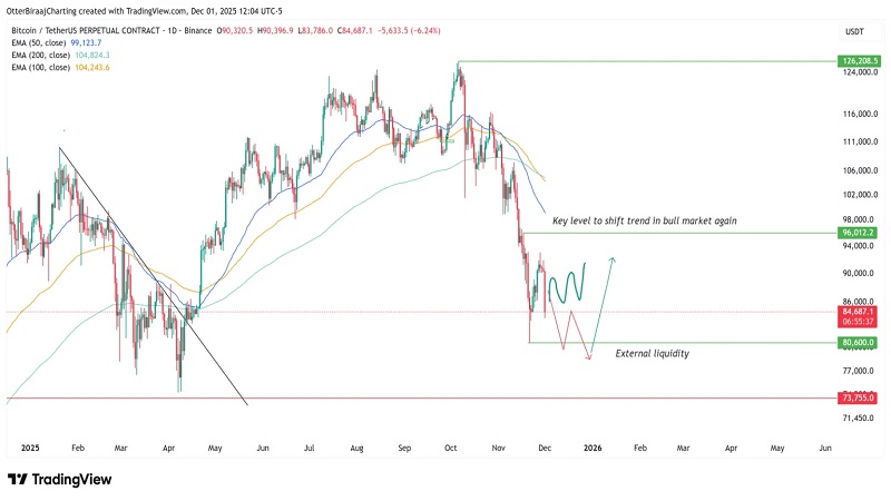 از منظر صعودی، بازآزمائی باند پایینی در محدوده ۸۰,۶۰۰ تا ۸۴,۰۰۰ دلار میتواند سازنده باشد. چنین حرکتی به BTC اجازه میدهد نقدینگی سمت پایین را جذب کرده و پیش از یک بازگشت قیمتی، پایه قیمتی تازهای ایجاد کند.