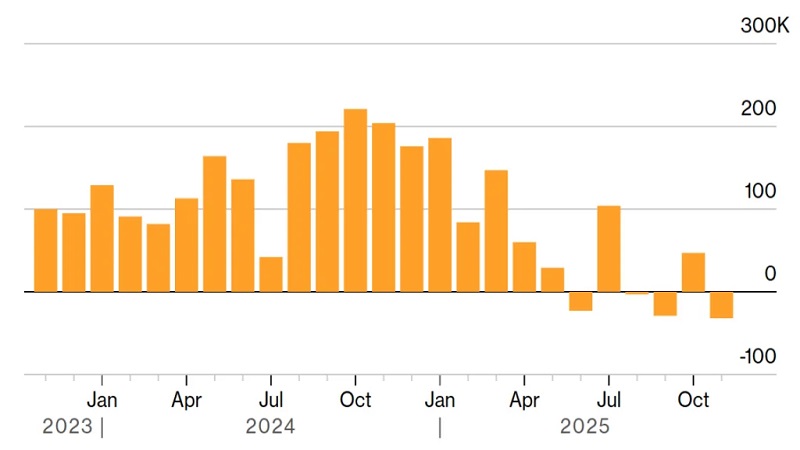 بازار کار آمریکا در ماه نوامبر نشانههایی از ضعف بروز داد؛ شرکتهای خصوصی ۳۲,۰۰۰ شغل حذف کردند و فشار بر کسبوکارهای کوچک افزایش یافت. طبق گزارش ADP، دستمزد کارکنان نیز نسبت به اکتبر ۰.۱٪ کاهش یافته که نگرانیهای تورمی را کمتر کرده است.