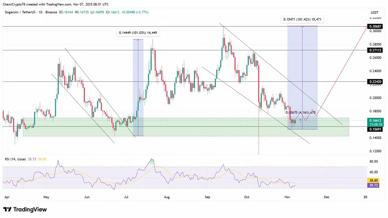 ساختار قیمت دوج کوین در حال حاضر شباهت عجیبی به الگوی ژوئن-ژوئیه دارد که نشان میدهد ممکن است یک جهش ۱۰۱ درصدی دیگر از سطوح فعلی در راه باشد.