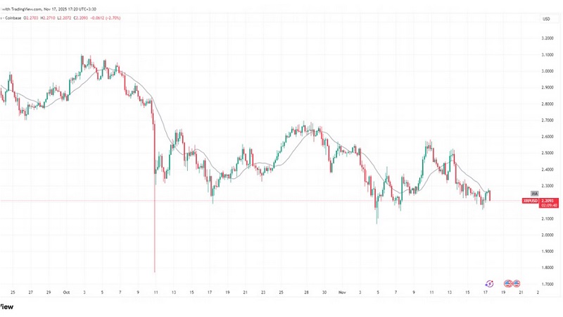 بررسی نمودار ۴ ساعته ریپل نشان میدهد که این دارایی پس از رشد پرقدرت اوایل اکتبر و عبور از سطح ۳ دلار، وارد یک اصلاح شده و اکنون حوالی ۲.۲۵ دلار معامله میشود. ساختار بازار نیز الگوی نزولی ملایمی را با ثبت کفها و سقفهای پایینتر نشان میدهد.