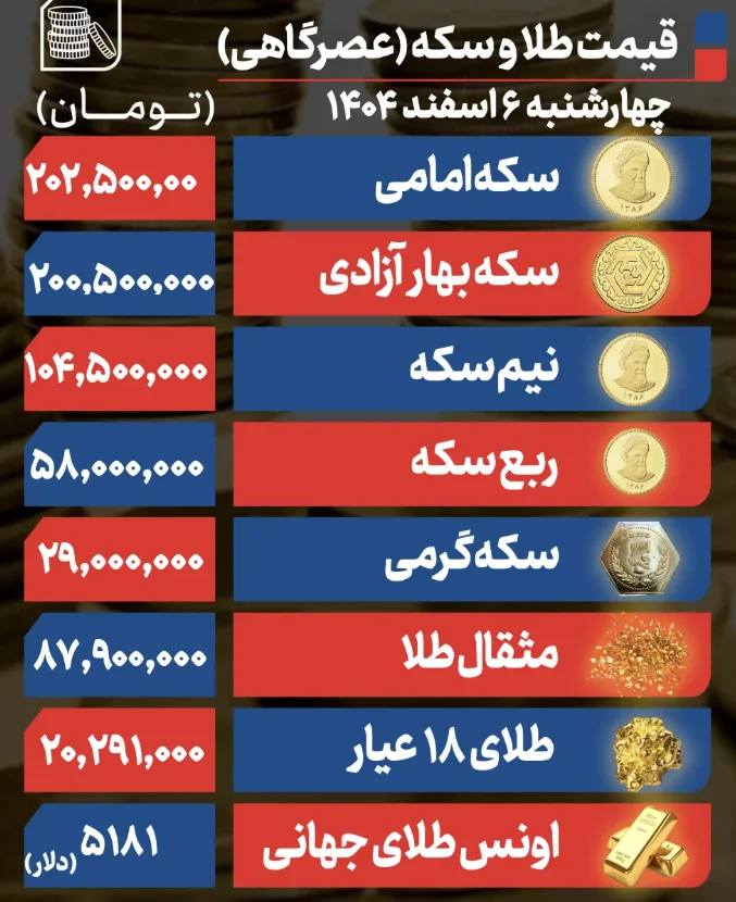 به گزارش هفت کریپتو، قیمت طلا و سکه در معاملات روز چهارشنبه ۶ اسفند ۱۴۰۴، با رشد محسوس در قطعات سنگین همراه شد. قیمت طلا در کانال ۲۰ میلیون تومانی پیشروی کرد و سکه امامی با ادامه روند صعودی، به محدوده ۲۰۲ میلیون تومان رسید. در میان قطعات مختلف، سکه بهار آزادی بیشترین افزایش ارزش را ثبت کرد و با رشد پنج میلیون تومانی نسبت به روز سهشنبه در کانال ۲۰۰ میلیون تومانی قرار گرفت.