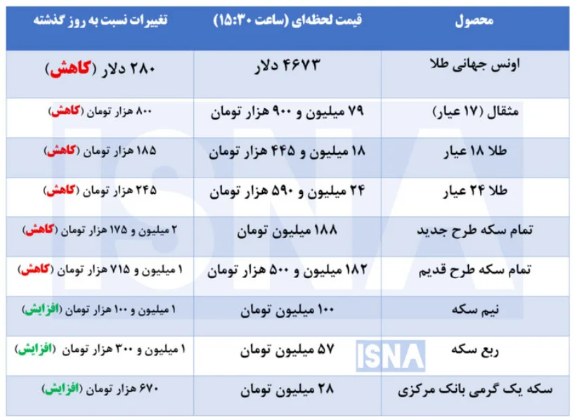 امروز همچنین هر قطعه تمام سکه طرح جدید نیز ۱۸۸ میلیون تومان، هر قطعه تمام سکه طرح قدیم ۱۸۲ میلیون و ۵۰۰ هزار تومان، هر قطعه نیم سکه ۱۰۰ میلیون تومان، هر قطعه ربع سکه ۵۷ میلیون تومان و هر قطعه سکه یک گرمی بانک مرکزی نیز ۲۸ میلیون تومان قیمت گذاری شد.