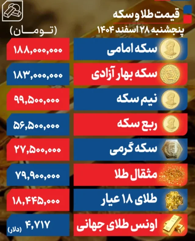 قیمت طلا و سکه امروز پنجشنبه ۲۸ اسفند ۱۴۰۴ در روند کاهشی قرار گرفته است. قیمت طلا پایین آمده و هر گرم طلای ۱۸ عیار به کانال ۱۸ میلیون و ۴۰۰ هزار تومانی رسیده است. قیمت سکه نیز در انواع قطعات نزولی شده و سکه امامی در کانال ۱۸۸ میلیونی معامله میشود.