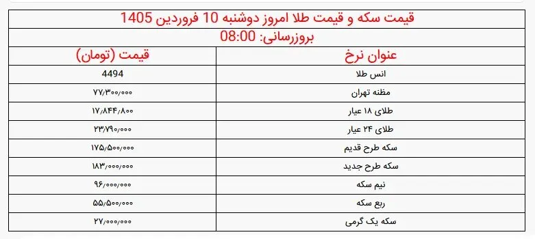 قیمت سکه و قیمت طلا امروز دوشنبه ۱۰ فروردین ۱۴۰۵ را در جدول زیر مشاهده کنید.