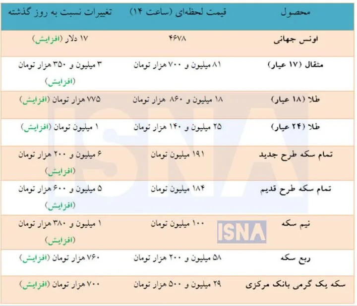 امروز همچنین هر قطعه تمام سکه طرح جدید نیز ۱۹۱ میلیون تومان، هر قطعه تمام سکه طرح قدیم ۱۸۴ میلیون تومان، هر قطعه نیم سکه ۱۰۰ میلیون تومان، هر قطعه ربع سکه ۵۸ میلیون و ۲۰۰ هزار تومان و هر قطعه سکه یک گرمی بانک مرکزی نیز ۲۹ میلیون و ۵۰۰ هزار تومان قیمت گذاری شد.