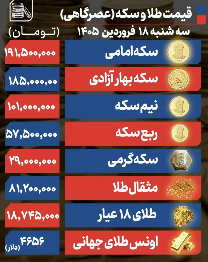 بر اساس اعلام اتحادیه طلا و جواهر تهران قیمت سکه امامی روز سهشنبه ۱۸ فروردین ۱۴۰۵ با رشد بیش از ۶ میلیون تومانی نسبت به روز دوشنبه روی رقم ۱۹۱ میلیون و ۵۰۰ هزار تومانی معامله شد. قیمت سکه بهار آزادی با همین مقدار رشد روی رقم ۱۸۵ تومانی معامله شد.